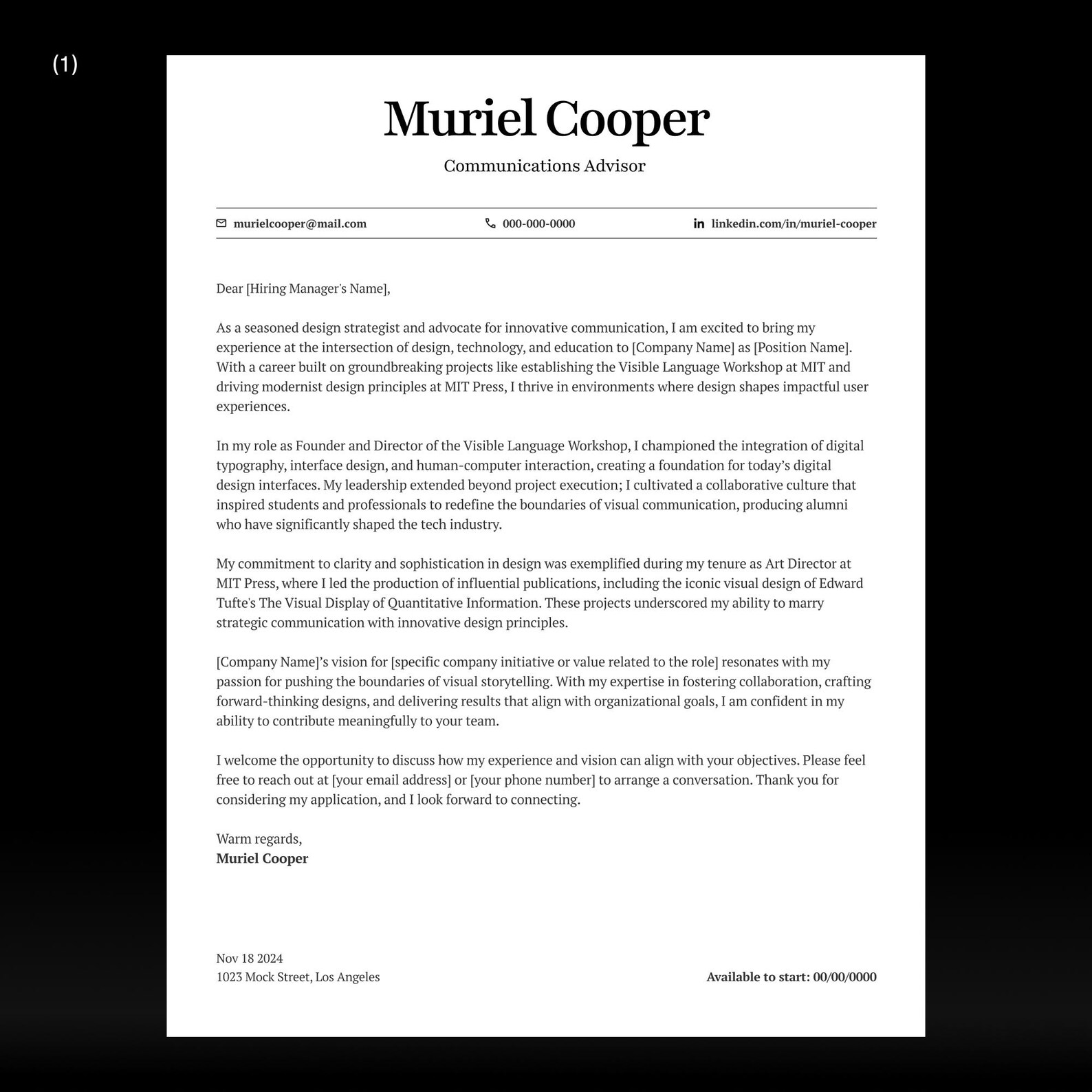 This cover letter template uses a simple serif structure that keeps your writing clear and easy to follow. It highlights your introduction, key experience, and motivation in a layout that feels organized and calm. The neutral design works for corporate roles, creative fields, and any application where clarity matters more than decoration.