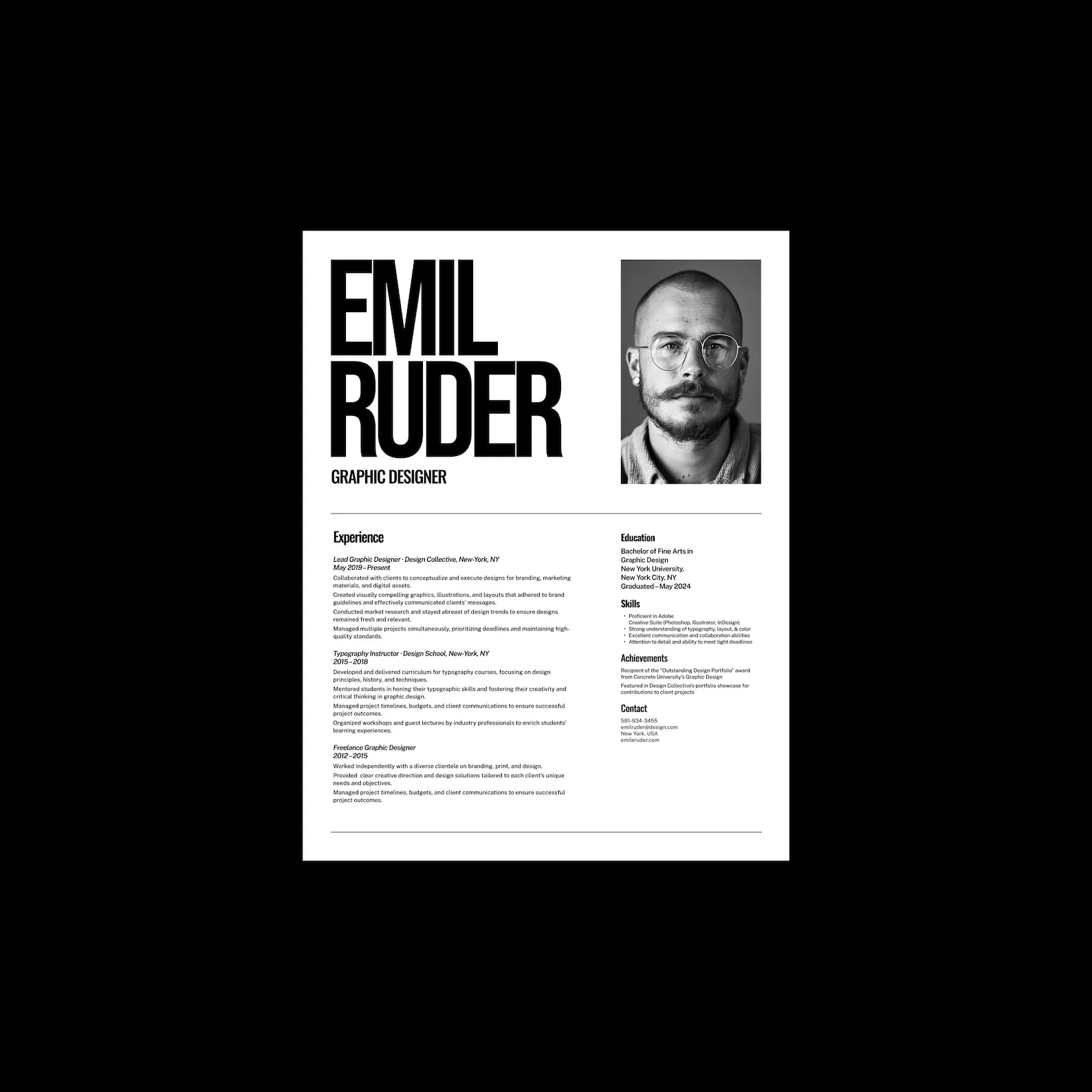 This resume template is designed for graphic designers and creative professionals who prefer a layout rooted in grid systems and visual order. The structure keeps sections such as skills, experience, and education easy to read, making it useful for applications, portfolio packages, or client-facing documents. Its minimalist format emphasizes information without decorative elements.