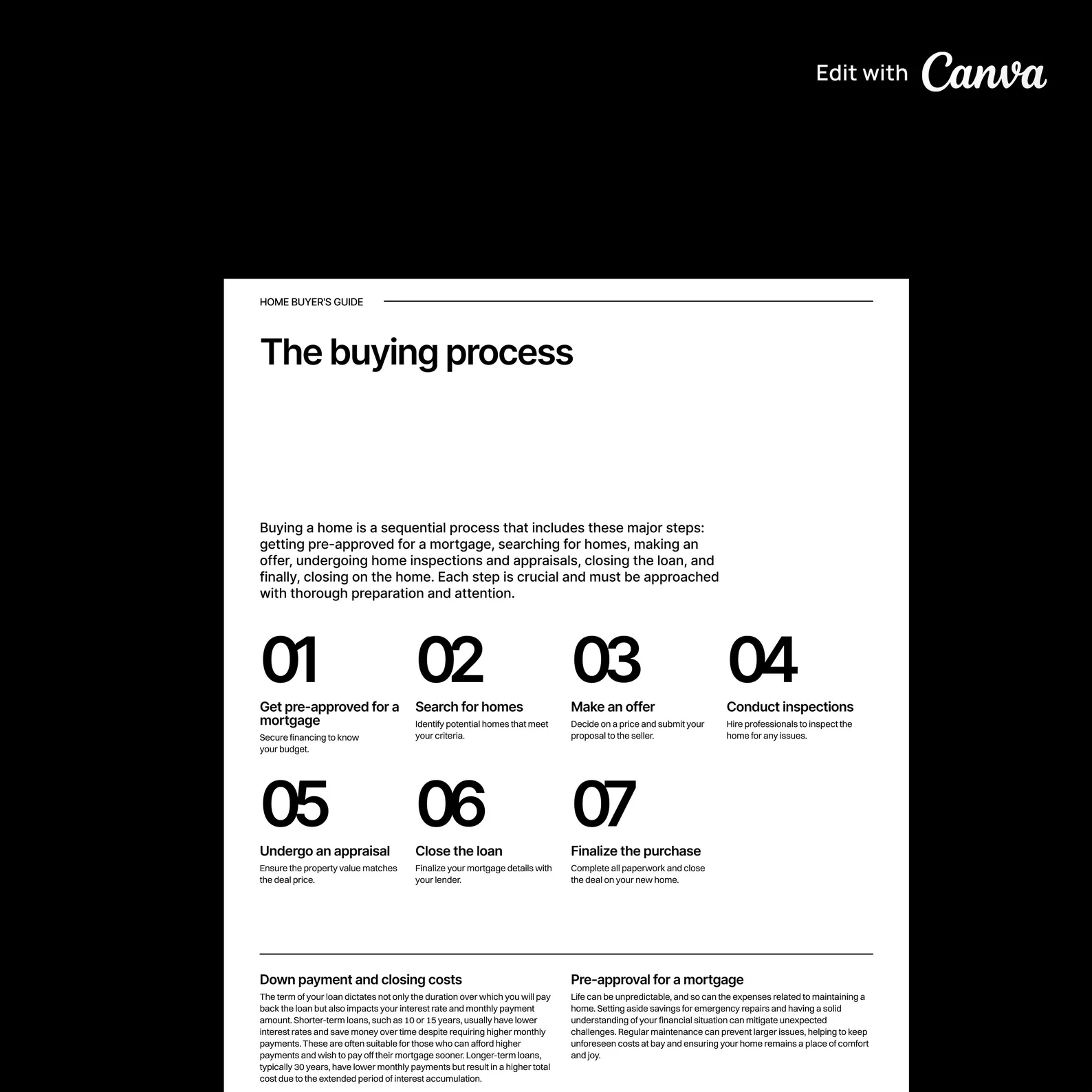 Present the buying or selling process in a layout that feels simple and easy for clients to follow. Each section helps you walk clients through key steps from first contact and preparation to offers closing and next steps. The structure keeps information organized so clients feel guided and informed.